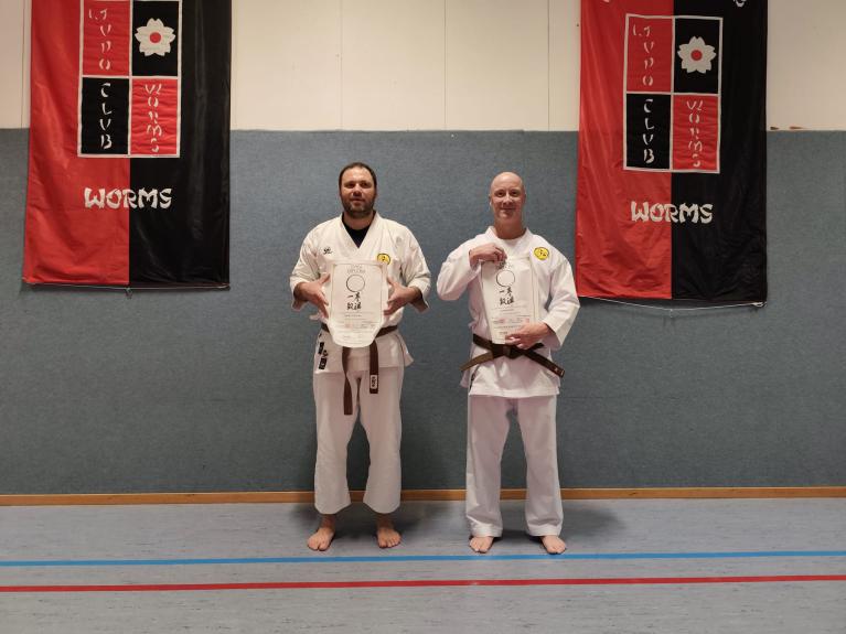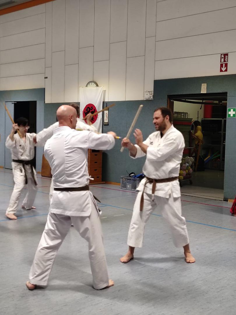 Am Samstag den 21. Dezember fanden die Dan Prüfungen des DKV in Worms statt. Vor den Prüfungen konnte man an einem Lehrgang teilnehmen. Der Lehrgang unter der Leitung von Marcus Gutzmer und Christoph Offen beschäftigte sich mit Karate Techniken gegen Stockangriff. Gleichzeitig wurde eine neue Kata vermittelt. Eine Sanchin Kata mit offenen Händen, die wir gerne in unser Programm aufnehmen werden.
