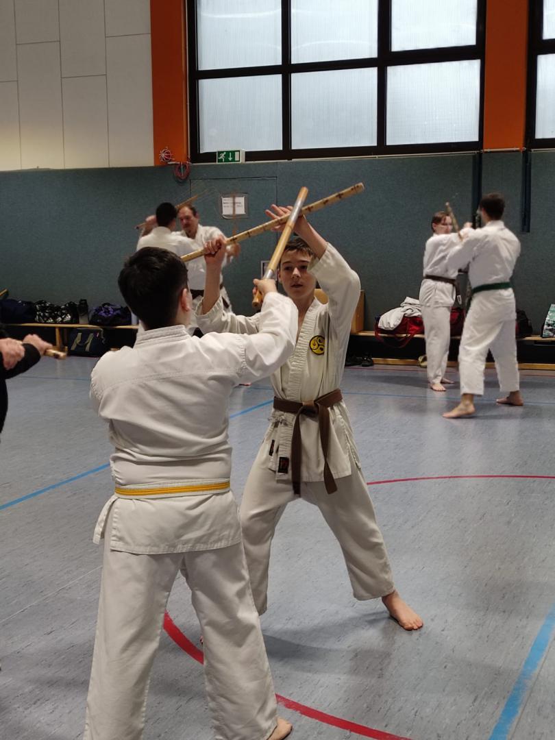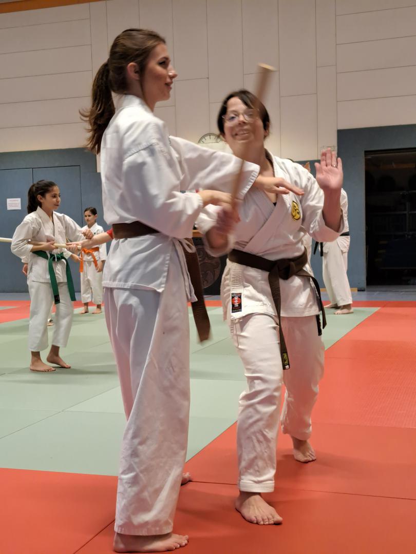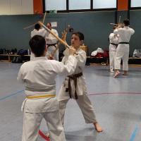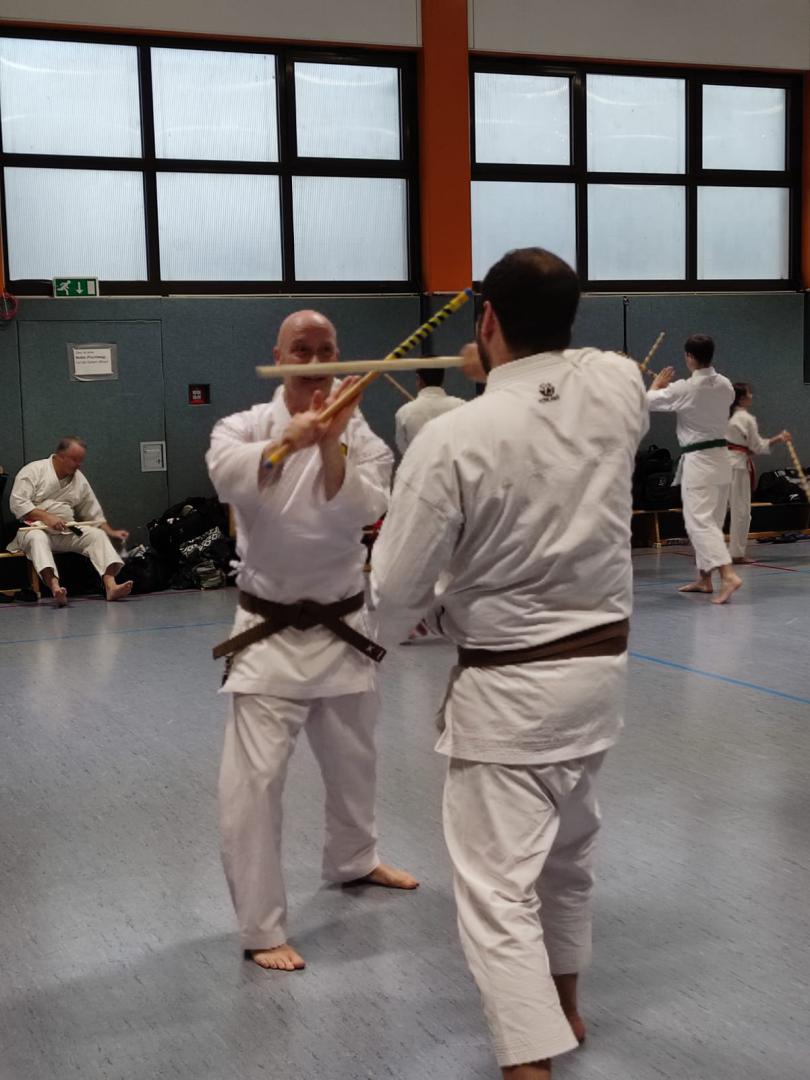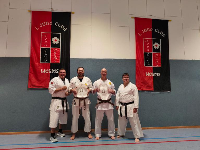 Am 23. November fuhren Martin Schramm und Andreas Frick nach Worms um sich der Prüfungskommision des DKV ( Sensei Marcus Gutzmer 7. Dan und Sensei Christoff Offen 6. Dan) zu stellen. Voran gab es einen Stick Fighting Lehrgang mit Bunkai Techniken aus Kata um einen Stockangriff abzuwehren. Dann zur Dan Prüfung mussten die Prüflingen das Kihon Programm der jeweiligen Prüfungskata laufen. Der 2. Teil umfasste den Kata Vortrag von Patsai Dai und Kushanku Dai. Dann wurde auch schon Bunkai der Kata Patsai Dai verlangt welche beide super meisterten. Als Wahlprogramm stand noch Kobudo auf dem Zettel. Matsuhiga no kon, Sushi no kon Dai, Noburo Tambo no Kata und Sekiun no Tambo wurden vorgetragen. Nach dem abschliessenden Kumite konnten beide ihre 1. Dan Urkunden entgegennehmen. Wir sind sehr stolz auf unsere frisch gebackenen Schwarzgurte und wünschen ihnen viel Erfolg für die künftige Laufbahn.