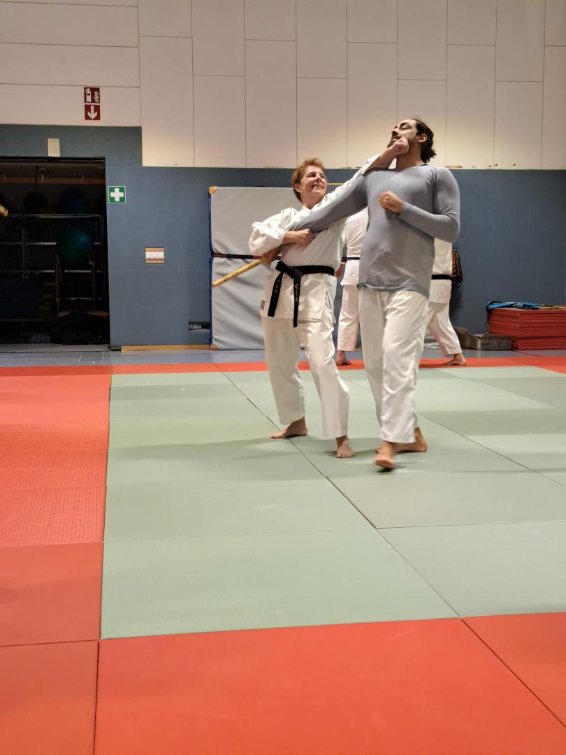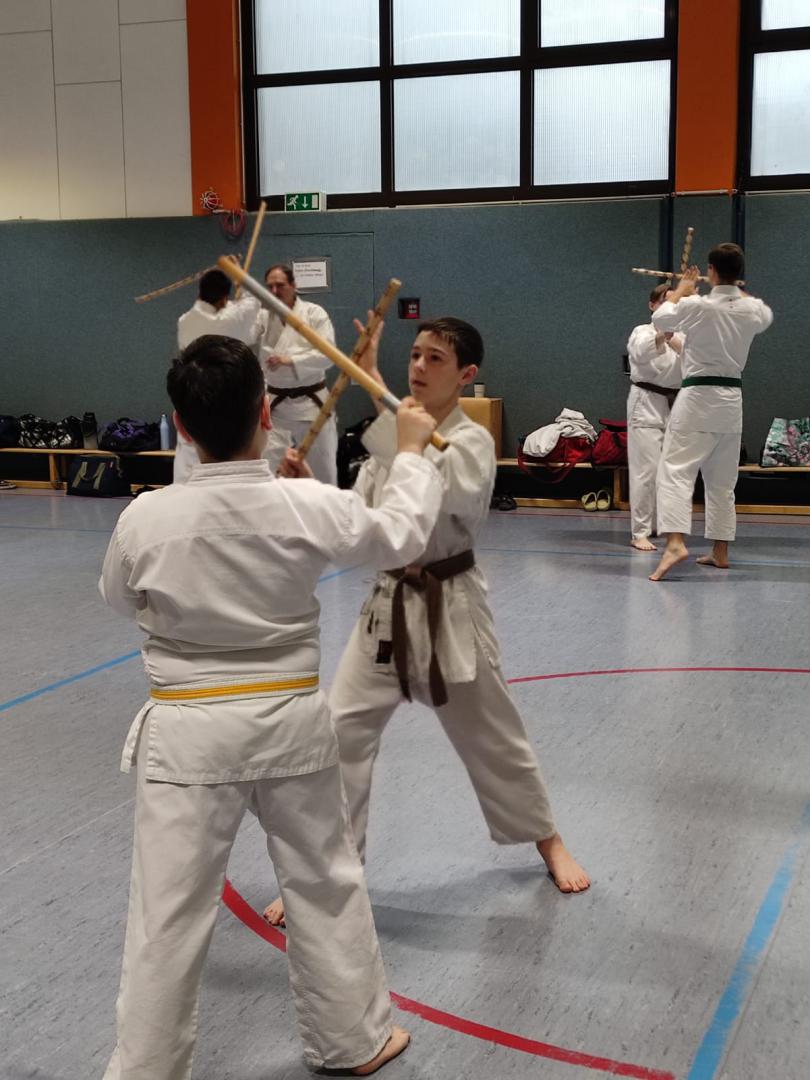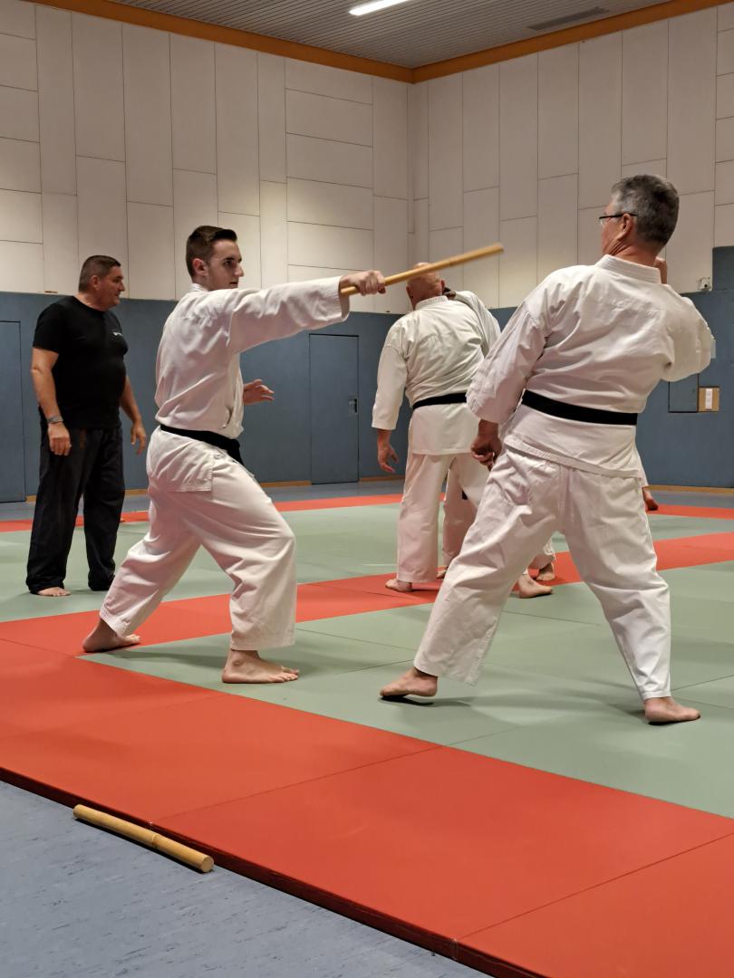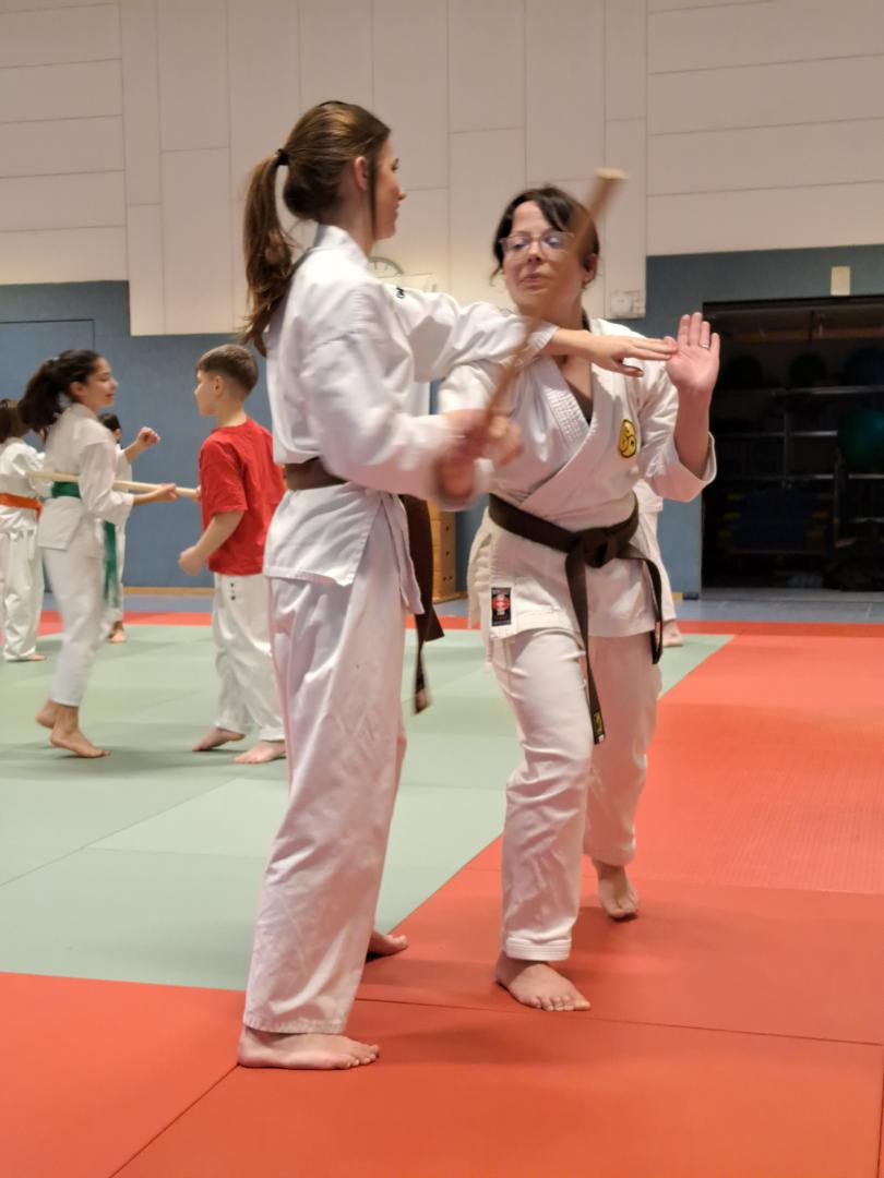 Am 23. November fuhren Martin Schramm und Andreas Frick nach Worms um sich der Prüfungskommision des DKV ( Sensei Marcus Gutzmer 7. Dan und Sensei Christoff Offen 6. Dan) zu stellen. Voran gab es einen Stick Fighting Lehrgang mit Bunkai Techniken aus Kata um einen Stockangriff abzuwehren. Dann zur Dan Prüfung mussten die Prüflingen das Kihon Programm der jeweiligen Prüfungskata laufen. Der 2. Teil umfasste den Kata Vortrag von Patsai Dai und Kushanku Dai. Dann wurde auch schon Bunkai der Kata Patsai Dai verlangt welche beide super meisterten. Als Wahlprogramm stand noch Kobudo auf dem Zettel. Matsuhiga no kon, Sushi no kon Dai, Noburo Tambo no Kata und Sekiun no Tambo wurden vorgetragen. Nach dem abschliessenden Kumite konnten beide ihre 1. Dan Urkunden entgegennehmen. Wir sind sehr stolz auf unsere frisch gebackenen Schwarzgurte und wünschen ihnen viel Erfolg für die künftige Laufbahn.
