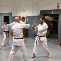Nach dem Lehrgang fanden die Kyu und Dan Prüfungen statt. Gezeigt werden musste Kihon aus den Katas, dann Kata und Bunkai und im Anschluss noch Kobudo.